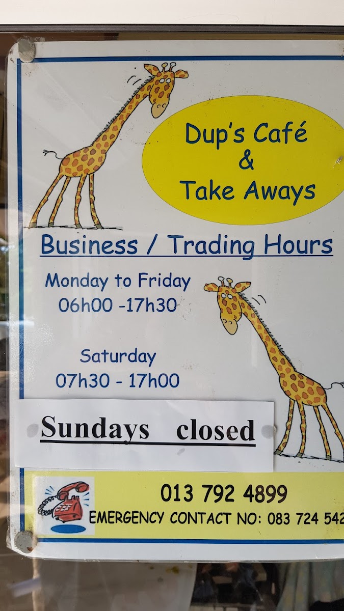 Contact Dup's Cafe And Take Aways at +27 83 418 3305 to get a taste of their delicious offerings or to find out what’s on the menu today. You won’t be disappointed!